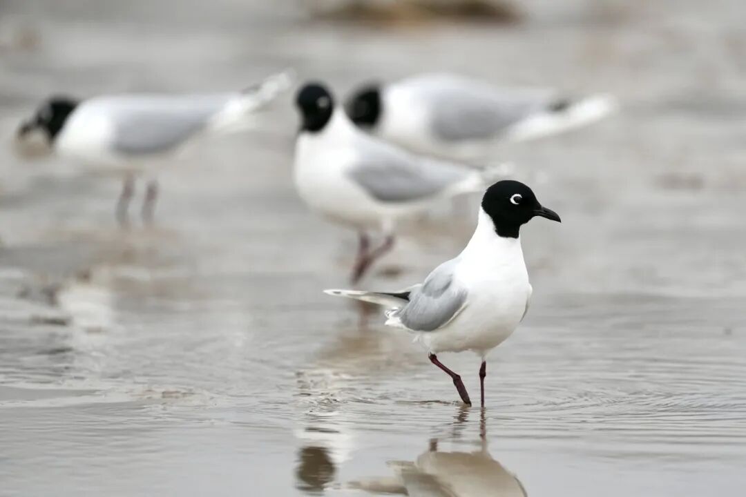 Flocks of Eurasian oystercatchers, Saunders's gulls and other species forage in groups. The mudflats witness thousands of birds taking flight together, their chirps rising and falling, forming a delightful scene with the tides and mudflats and exuding the full vitality of spring.